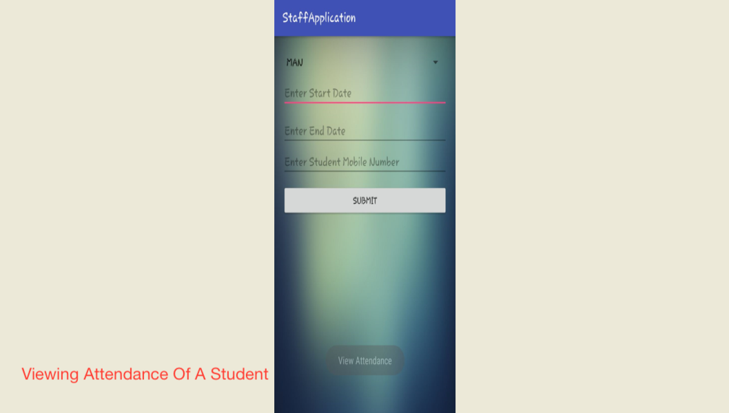 Students and teachers both can view their attendance and the entire class's attendance(defaulter list) respectively between a particular date. The teacher has the choice to view a particular student's attendance too.