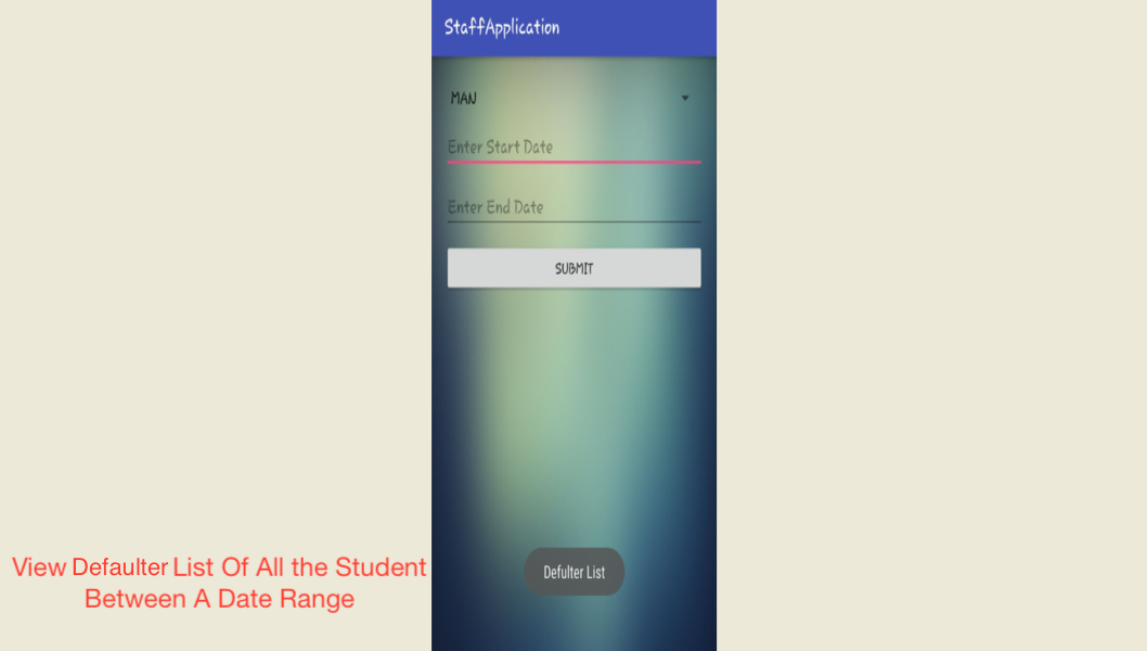 Students and teachers both can view their attendance and the entire class's attendance(defaulter list) respectively between a particular date. The teacher has the choice to view a particular student's attendance too.